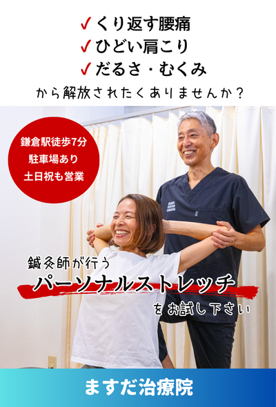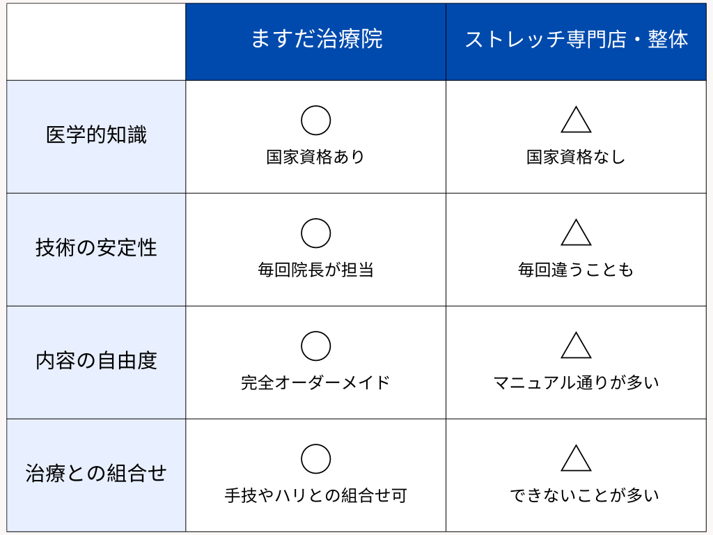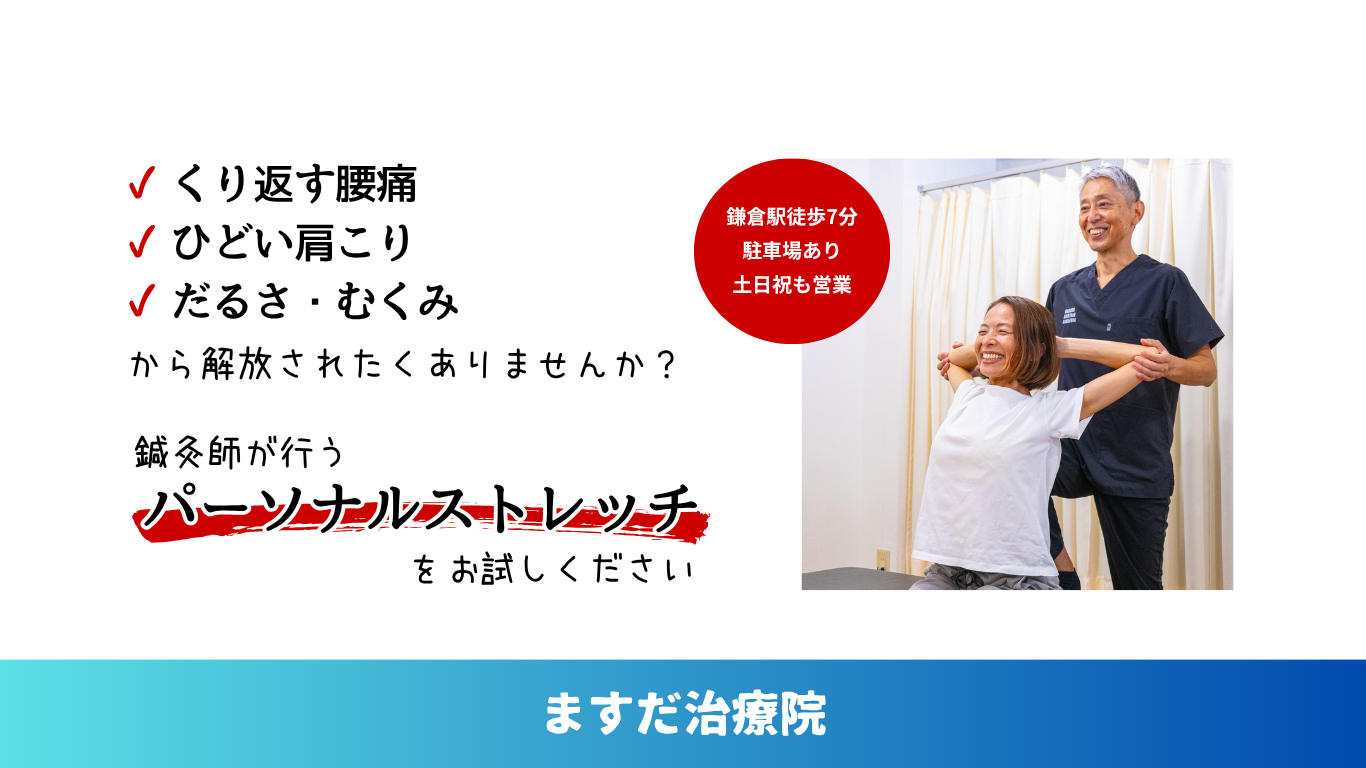 硬すぎてうまく伸びない、ストレッチだけでは改善しない場合は、手技やハリなどとの組み合わせも可能です。